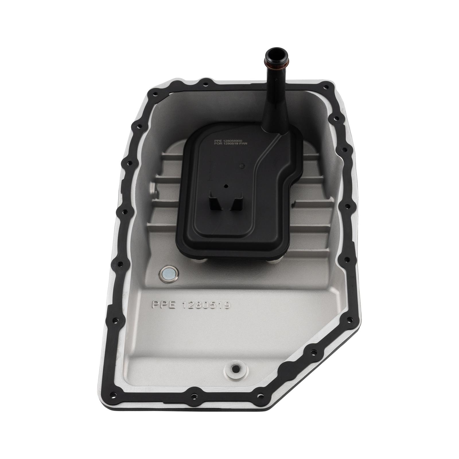 Check your vehicle for clearance issues with the exhaust, drive shaft, and frame cross members. For filter replacement, use PPE Transmission Filter SKU 128058900.