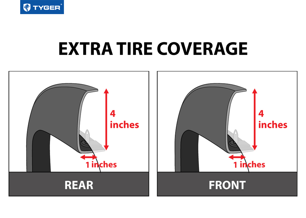 - Dimensions - Flare Height: 4 inch in front and 4 inch in rear. Tire Coverage: 0.75 inch in front and rear.