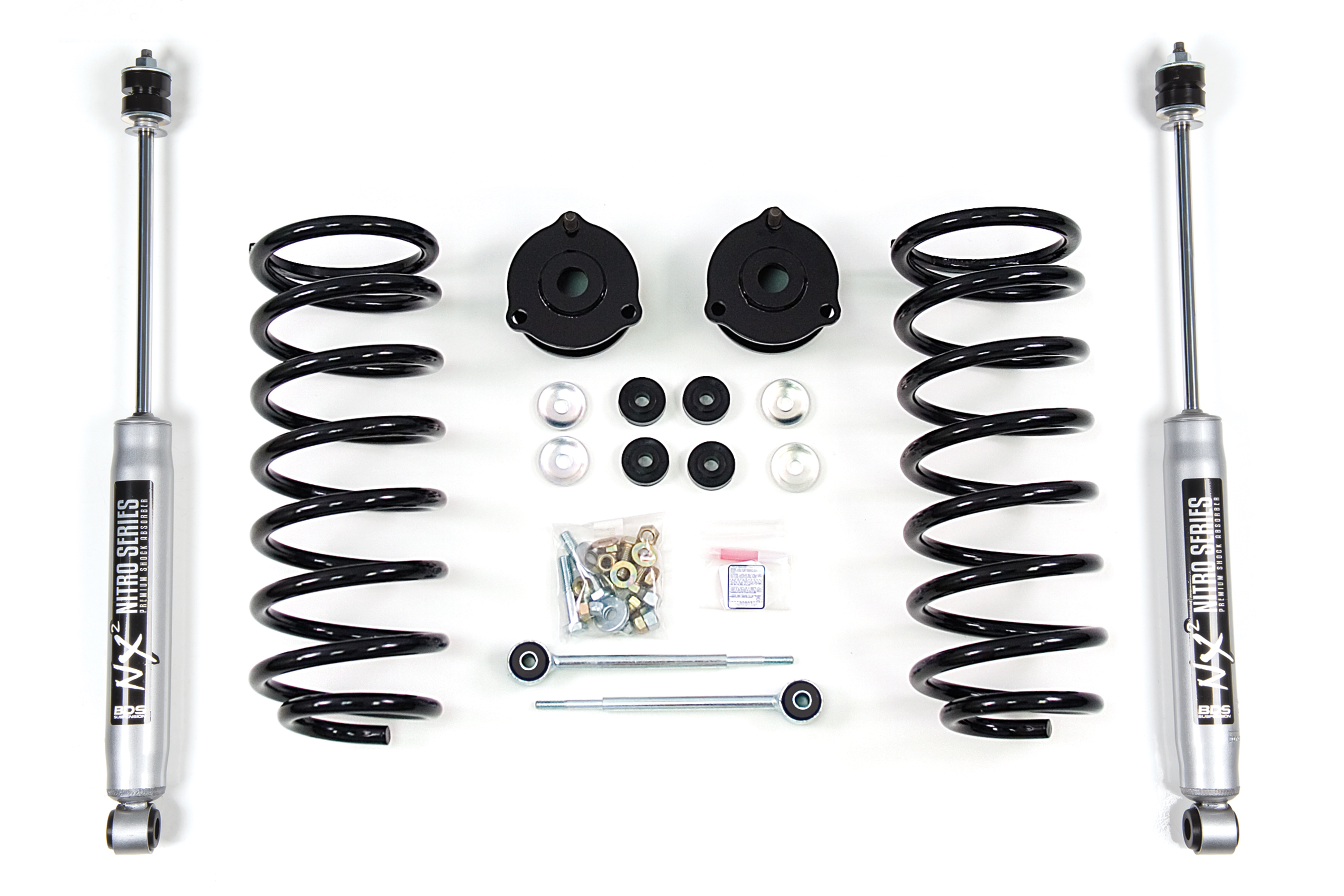 Up front the lift kit includes top mounted steel strut spacers. In the rear this kit utilizes custom tuned BDS Pro-Ride coil springs and rear sway bar links. With the new stance set, NX2 series nitro shocks are used to retain the ride quality and allow full articulation of the rear suspension.