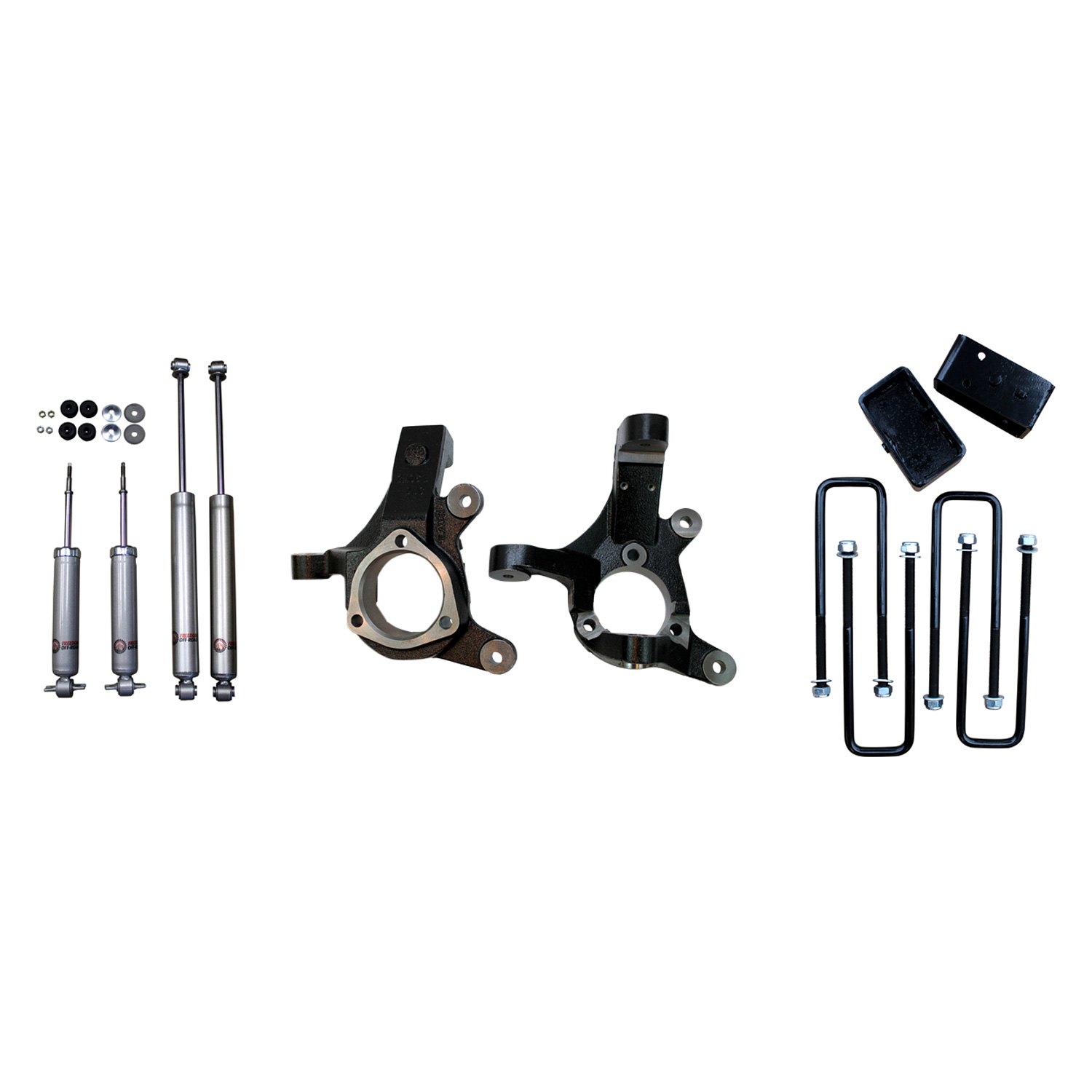 - Cast 3 Inch Front Lift Spindles Maintain OE Ride Quality Rear 2 Inch Lift Blocks With Extended U-Bolts