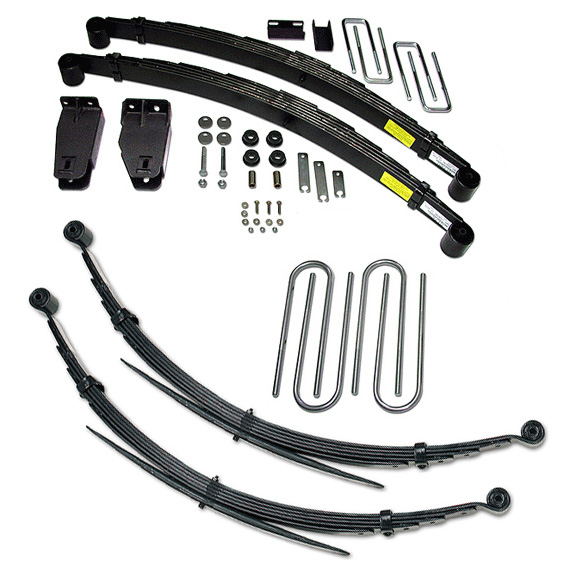 - Includes: 2) Front leaf springs (w/poly bushings), 2) Axle Pivot Brackets (w/cam bolts), 2) Rear leaf springs, 2) Front Sway Bar Drop Brackets, 4) Front U-bolts, 4) Rear U-bolts, 2) Front Brake Line Extension Brackets, 1) Rear Brake Line Extension Bracket, 1) Hardware Bag, 4) Poly Shackle Bushings