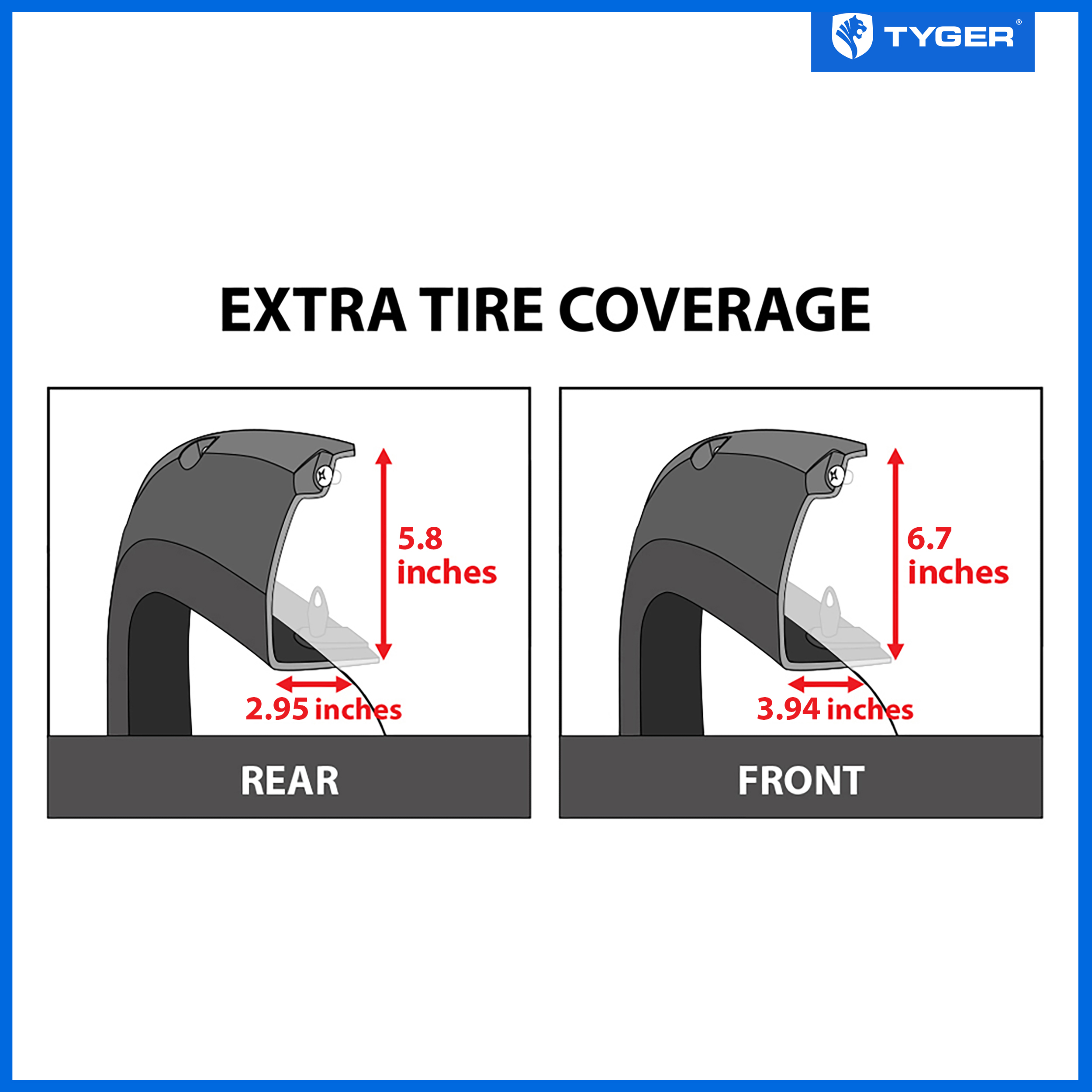 Tyger fender flares are made of impact-resistant polypropylene with developed injection molding technology. The rugged appearance bolstered by recessed stainless steel rivets emphasizes their enormous presence and adds significant tire coverage to keep dirt and debris off the vehicle! Tyger's upmarket, trim grade Pocket Style Fender Flares never disappoint.