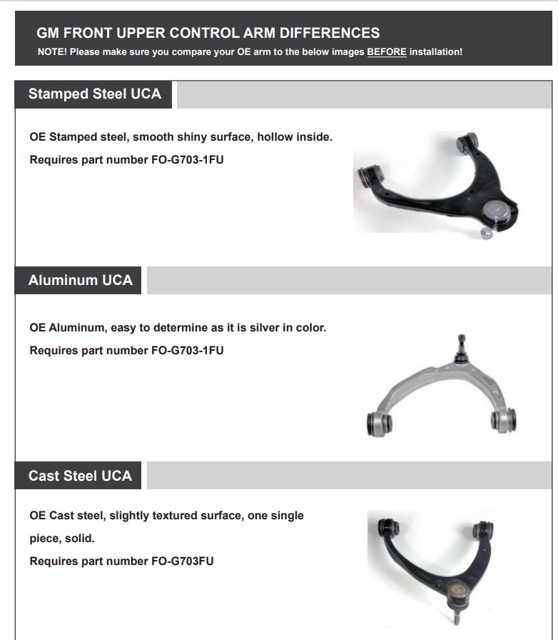 Front Upper Control Arms for 2-4 Inch Lift 07-16 Escalade 07-16 Escalade ESV/07-13 Escalade EXT/07-13 Avalanche/07-18 Sivlerado/Sierra 1500/14-20 Suburban 1500/07-20 Tahoe/07-20 Yukon/15-20 Yukon XL 07-14 Yukon XL 1500 Freedom Off-Road
