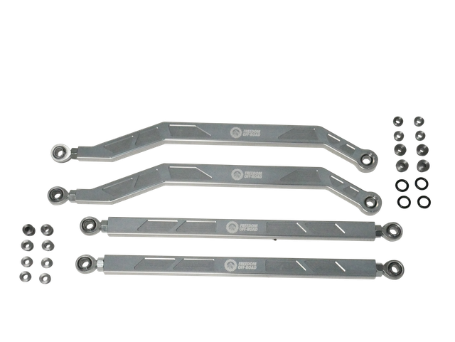 Freedom Off-Road heavy-duty high clearance radius rods stand-alone using the highest quality materials in the industry. It is fully adjustable and allows for an additional 2.5 inches of ground clearance. Direct bolt-on install with substantial weight savings over factory yet six times as strong.