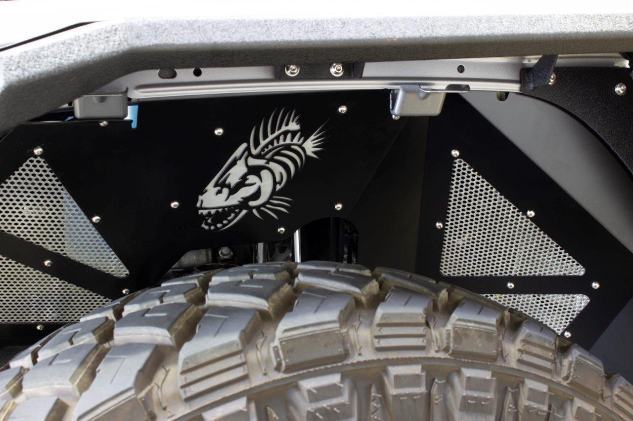 If you have Tube Fenders, you need a set of Aluminum Inner Fenders to finish the look. Once installed these offer protection from rocks and debris entering the engine compartment. These are stamped from Aluminum with the Fishbone Offroad Logo then powder coated black.