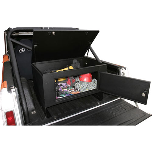 This heavy duty, high security, 16-gauge steel trunk mounts in place of the rear seat. The lockable trunk is great for tools, camping gear, equipment, and much more. The trunk can be accessed through the large top lid, or through the independently opened rear door. A unique hinge design allows the Lockbox to be flush mounted without affecting hinge operation.