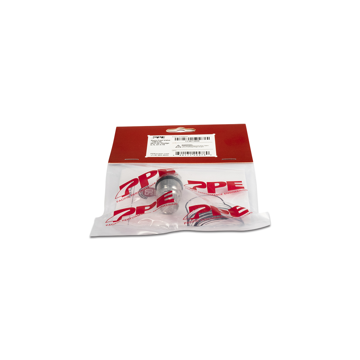California Air Resources Board Executive Order No. D-701-12. The PPE Race Fuel Valve (heat-treated stainless steel) replaces stock or a shimmed pressure relief valve. This valve helps maintain fuel rail pressure during high engine load conditions.