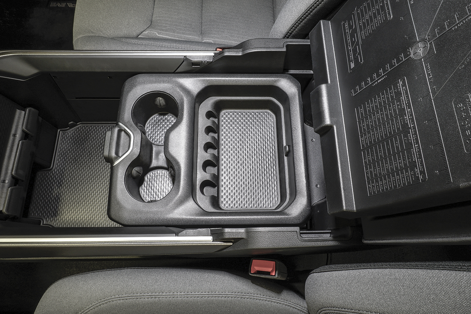 NOTE: Full Length Floor Console and drilling are required. Does not work with the RAM sliding console trays that have lids on the cup holders, as seen on RAM Longhorn and Limited trims.