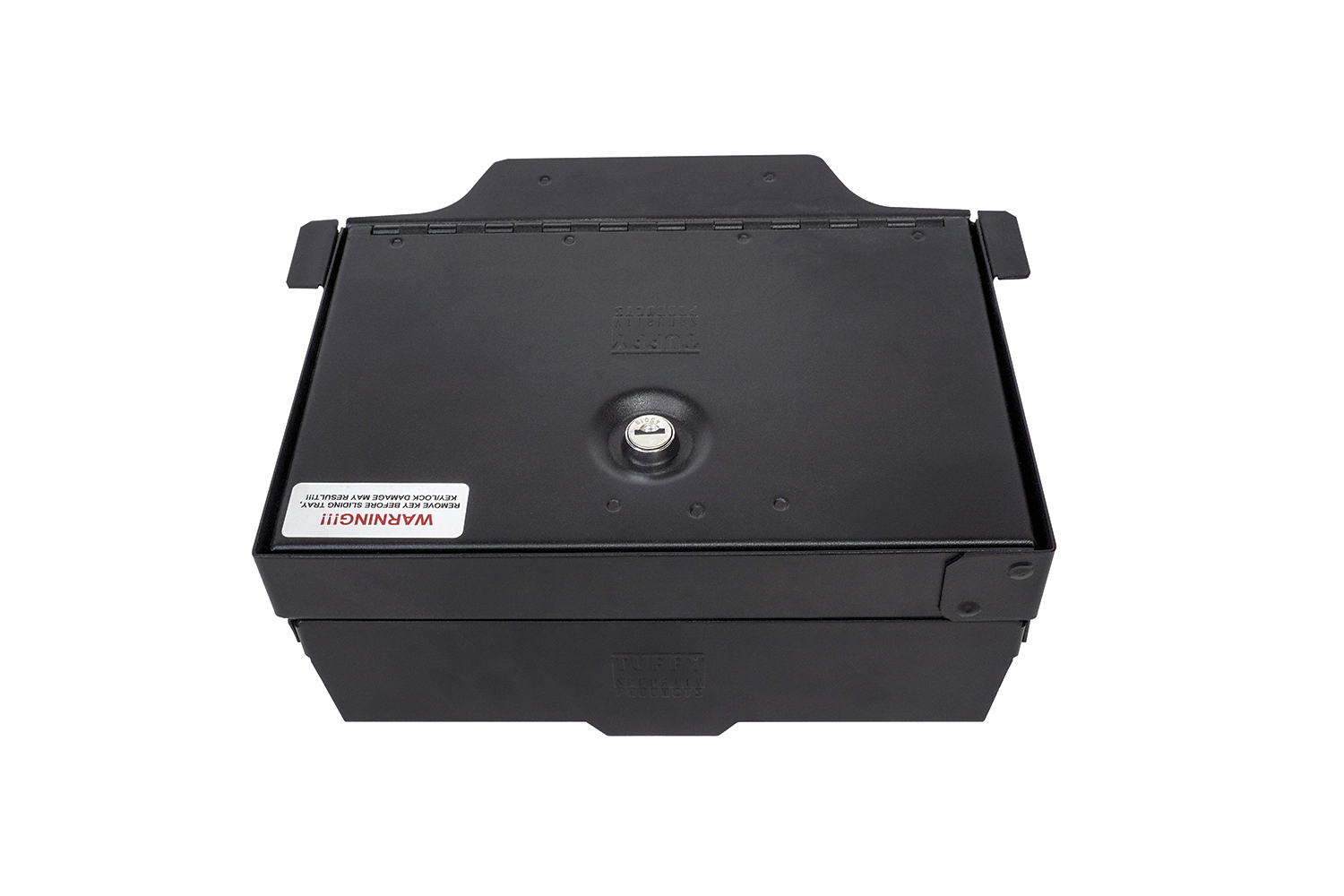 The embossed lock is flush with the lid, providing maximum secured storage under the sliding tray. The key can only be removed when the console is locked and must be removed in order to slide the OEM tray backwards.