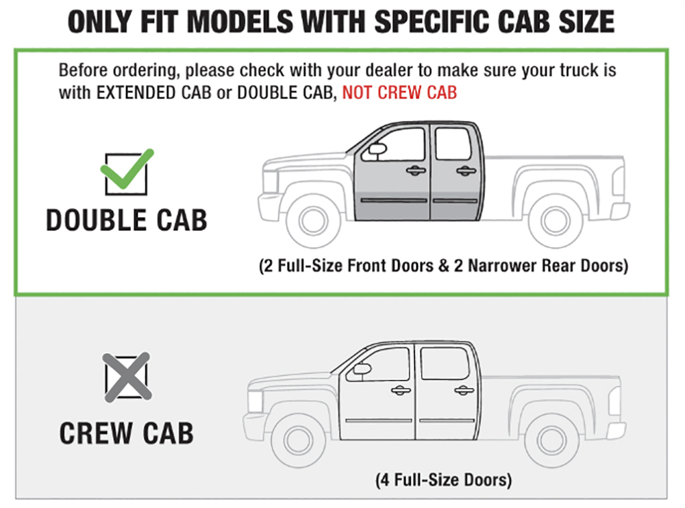 - Important: Only fit Extended or Double Cab with 2 full-size front doors and 2 narrow rear doors. Not for Crew Cab with 4 full-size doors.(Please check the Cab Size picture.); DO Not FIT 2019 Silverado and Sierra 1500 LD and Limited + 2019 Silverado and Sierra 2500 and 3500