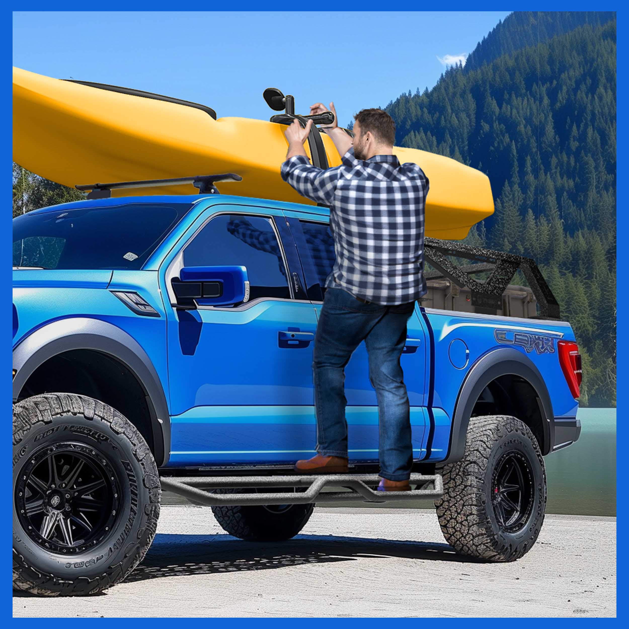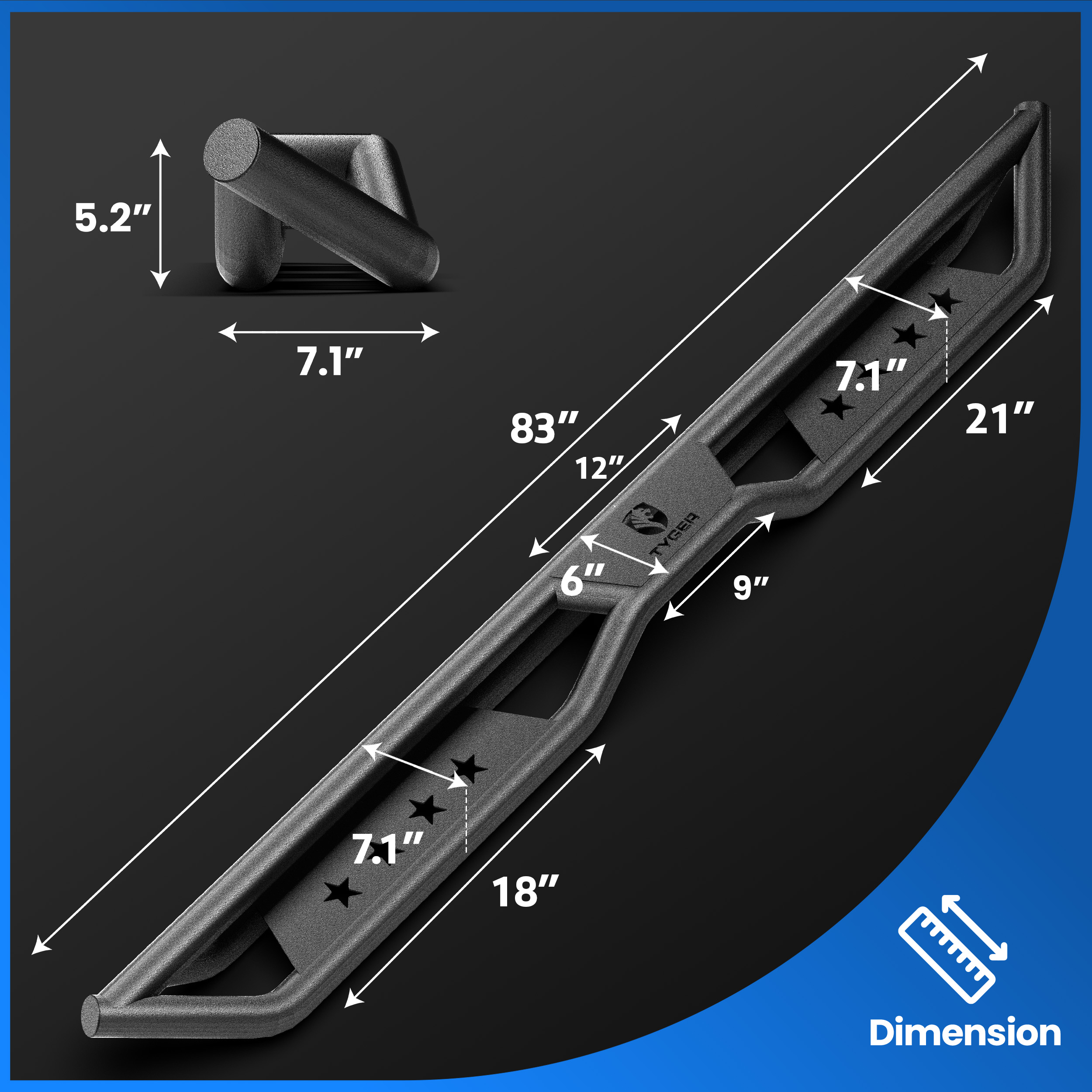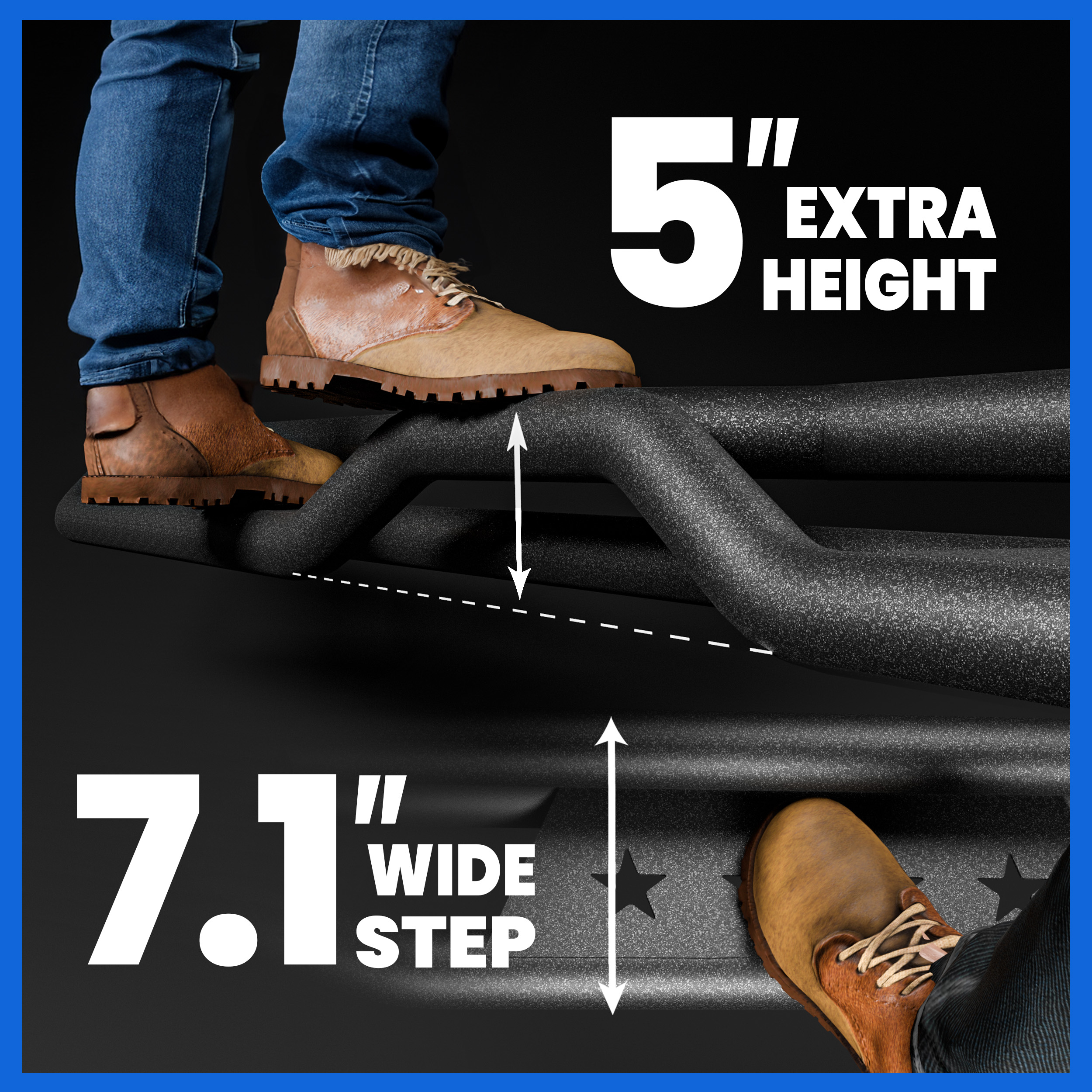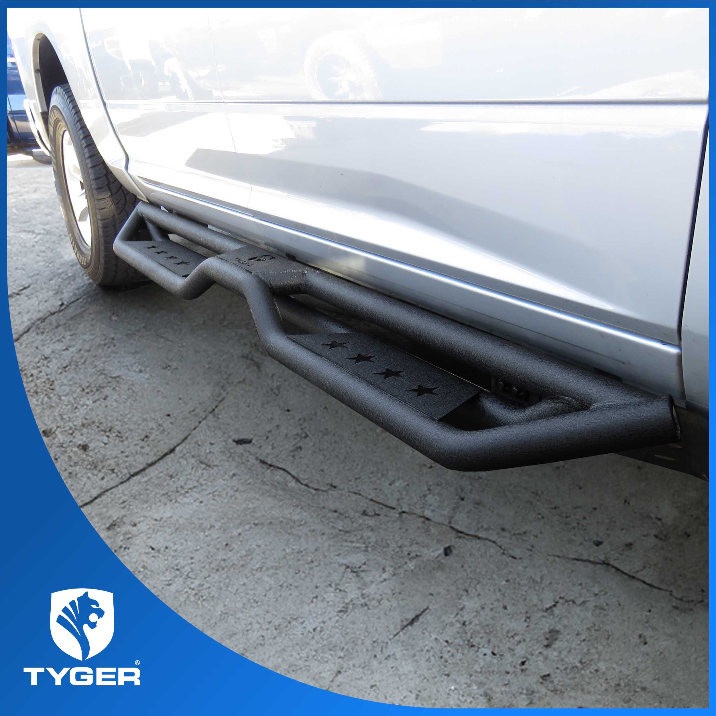 The Seamless Tri-Tube Structure Is Made Of Heavy-Duty 2 Inch Diameter Carbon Steel Tube Finished With Tyger's Signature Textured Black Finish That Provides Excellent Corrosion And Rust Resistance. The Super Stylish W-Rails Carve Out The Space To Support Two 7.1 Inch Wide Drop Step Pads And A 6 Inch Wide Step-Up Pad In The Middle; The 5.2 Inch Step-Drop Is Perfect For Vehicles That Are Lifted And The Elevated Step Provides Access To All The Exciting Outdoor Gear You Would Store On The Roof.