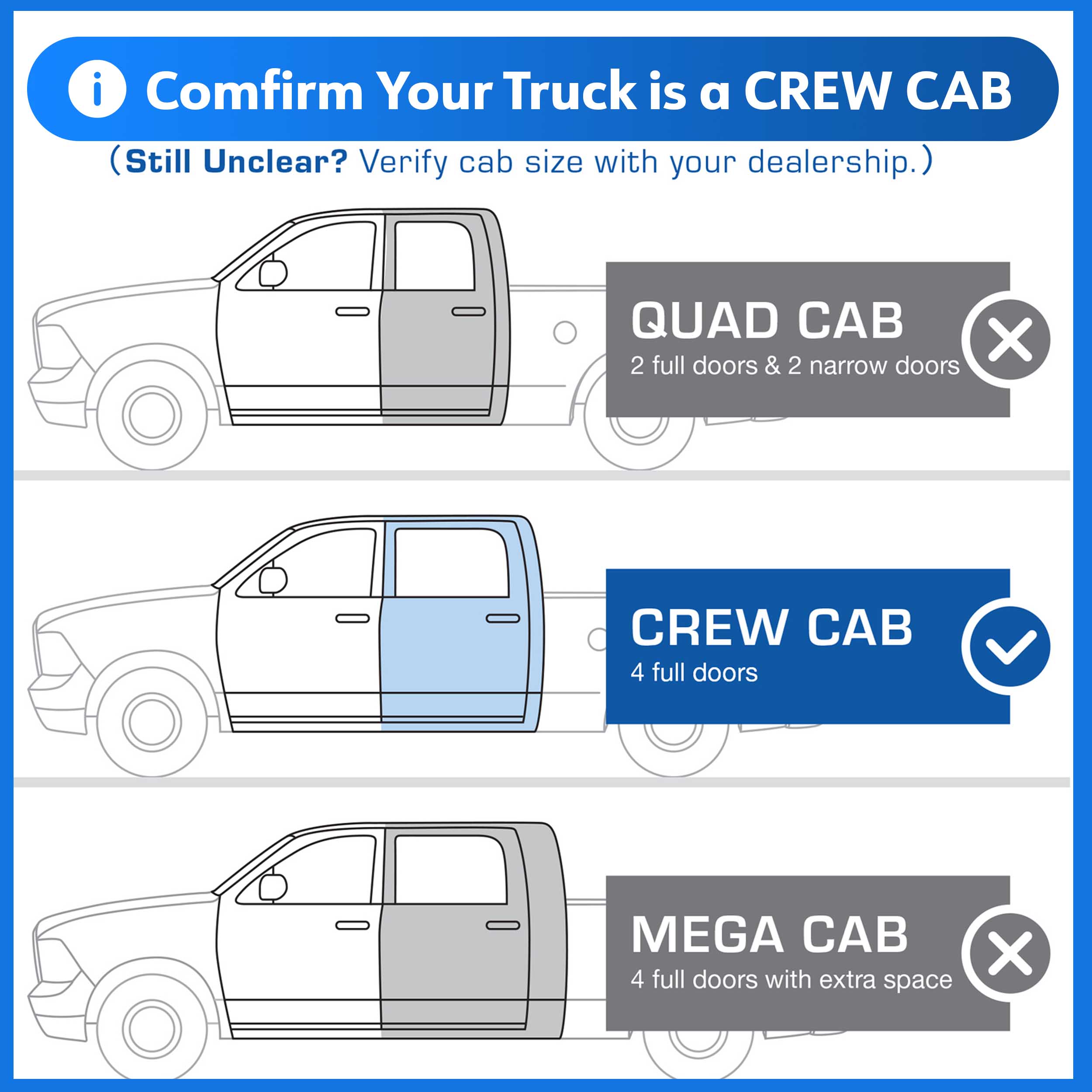 - Fitment - Compatible with 2009-2018 Dodge Ram 1500; 2010-2024 Ram 2500 3500; 2019-2024 Classic, Crew Cab (Cab Size Note: Only fit Crew Cab with 4 full-size doors. Not for Quad Cab or Mega Cab.), Not compatible for Chassis Cab and Diesel models; 5th Gen 2019-UP Ram 1500 New Body Style, For 2009-2011 and some 2012 models, it requires minor drilling of 1/4 inch holes through the pinch weld for support brackets.